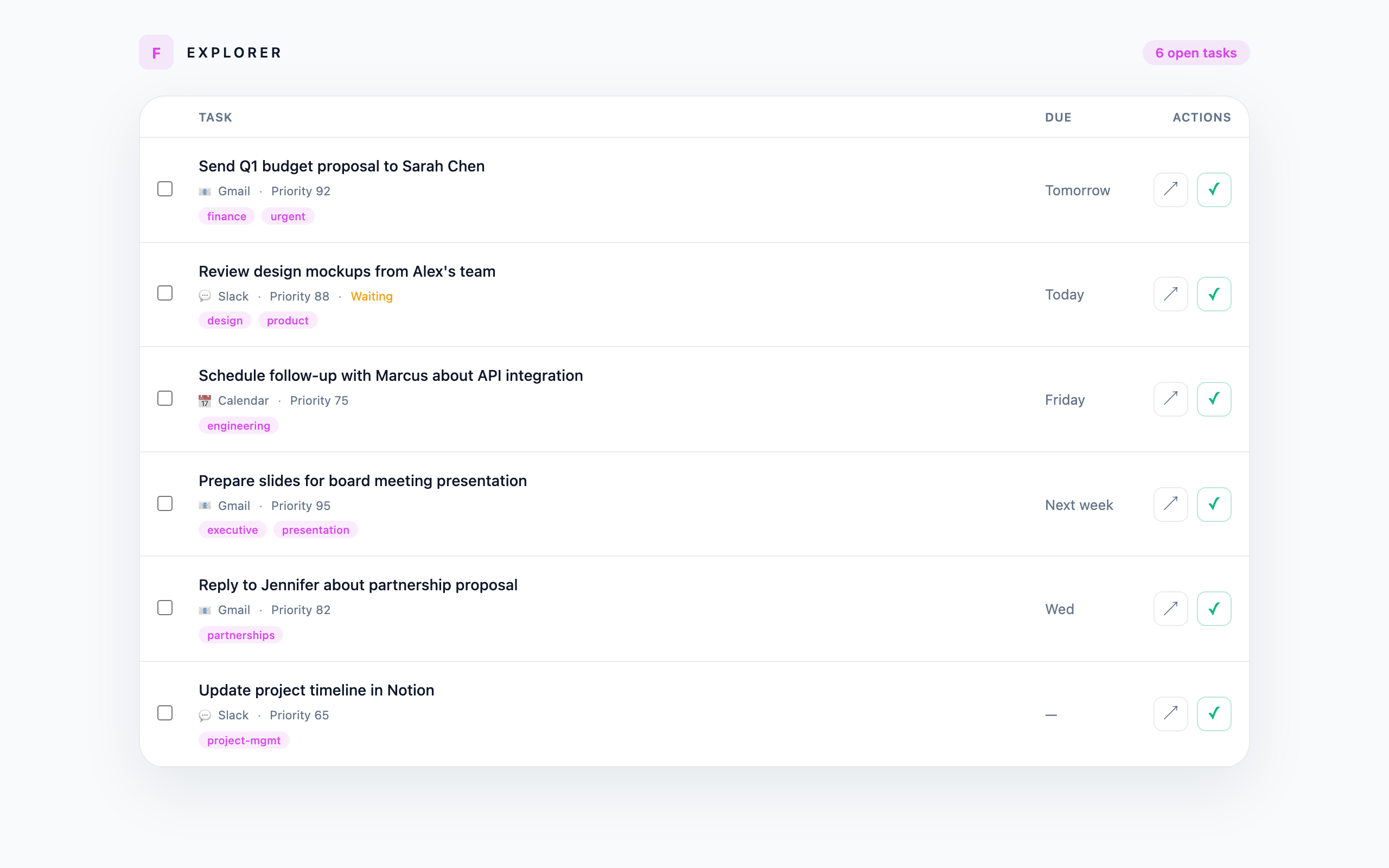 AMP email, Slack DM, and the PWA inbox stay perfectly in sync. Tasks close the moment threads resolve in Gmail, Slack, Drive, or Calendar.